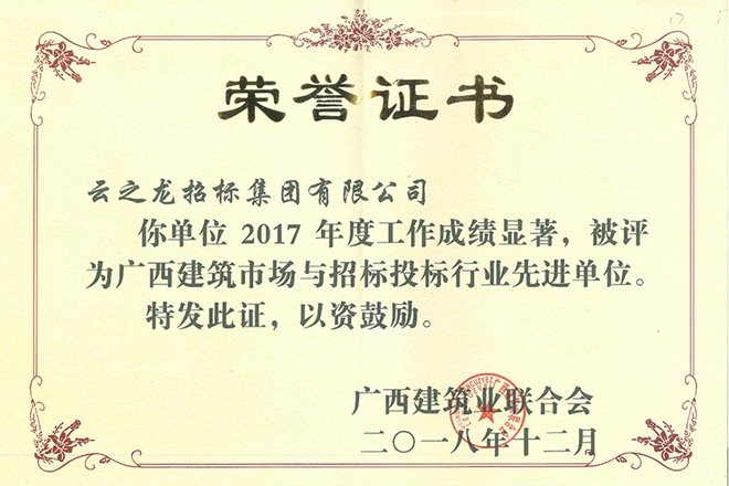 “2017年度廣西建筑市場與招標投標行業先進單位”證書